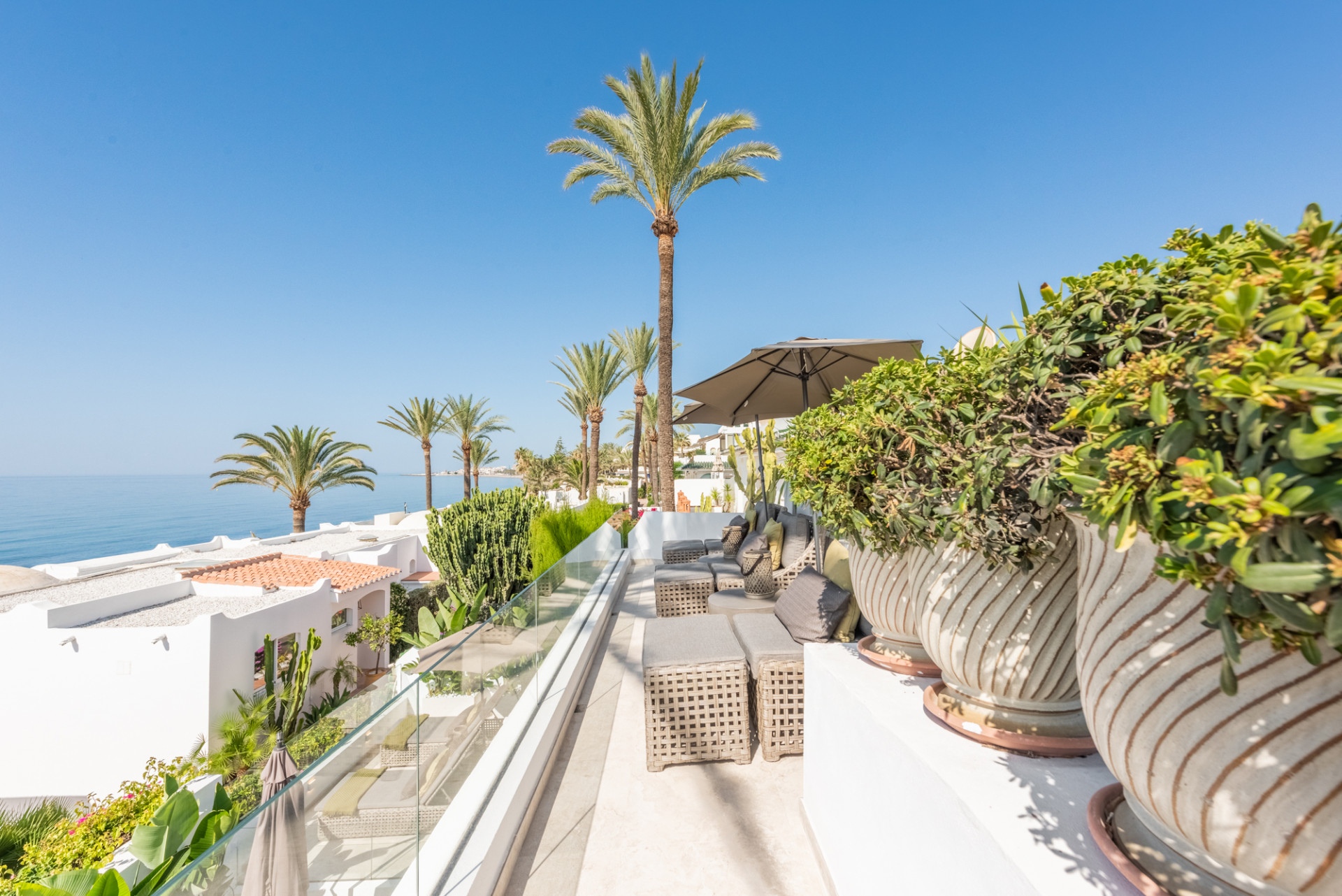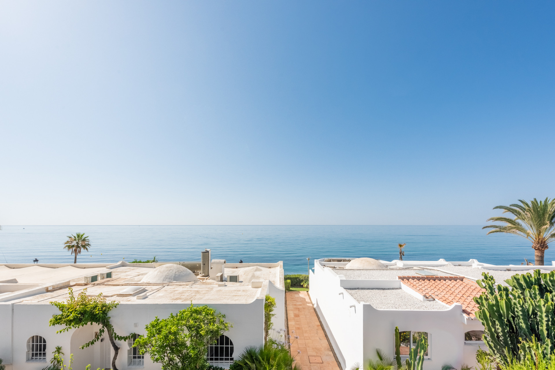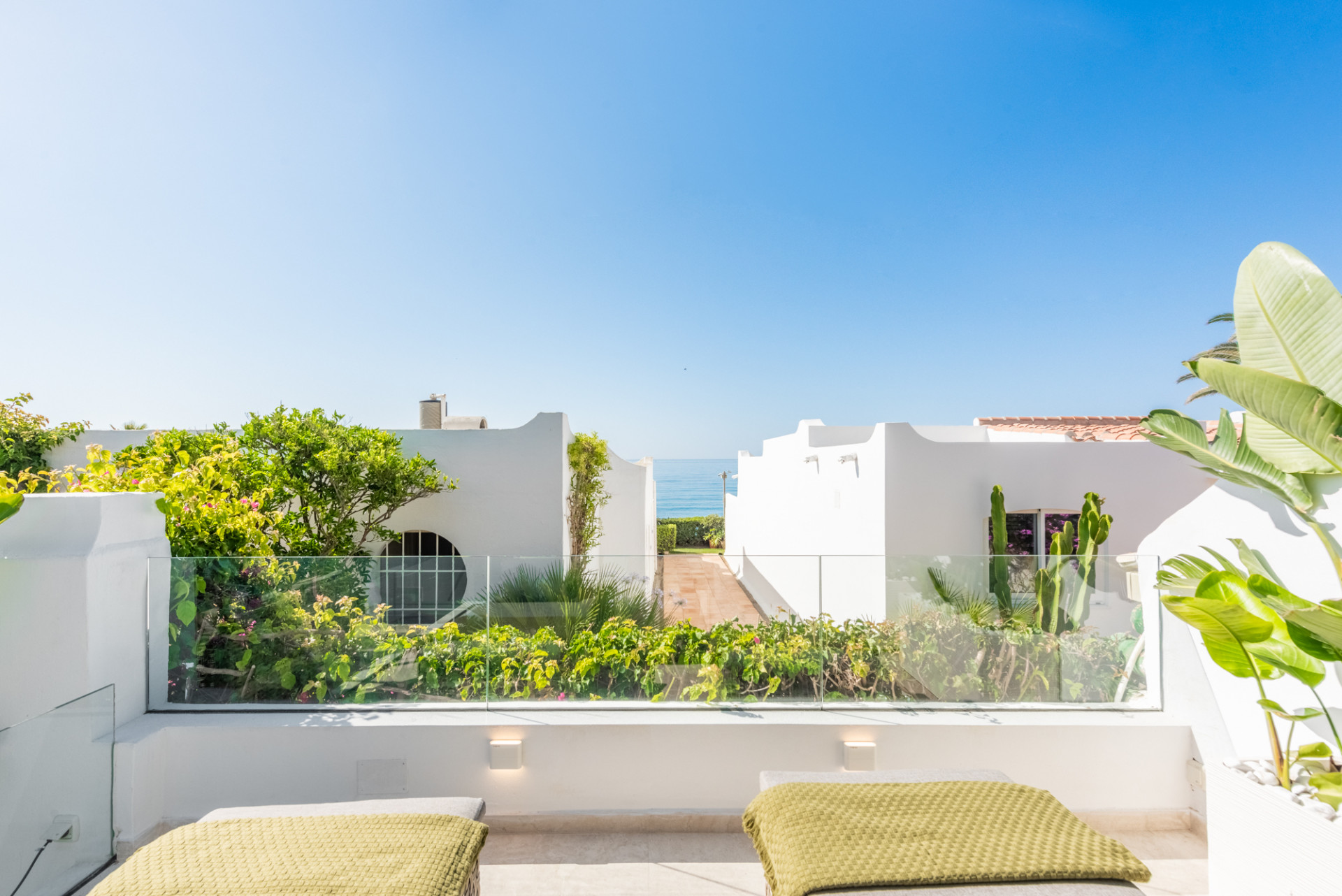 Esta casa de estilo bungalow frente a la playa está literalmente a pocos pasos del mar, situado en la urbanización Oasis Club. Una zona residencial en la Milla de Oro que tiene una ubicación privilegiada en la costa y tiene un gran club de playa dentro de la comunidad. Este complejo está muy cerca de todos los servicios y zonas de ocio de la Milla de Oro y tiene acceso privado directo a la playa y el paseo marítimo desde donde podemos dar un agradable paseo hasta llegar a Puerto Banús a un lado y Marbella hacia el otro lado pasando por los Puente Romano y Marbella Club Grand Luxury Hotels y sus respectivos restaurantes conocidos.