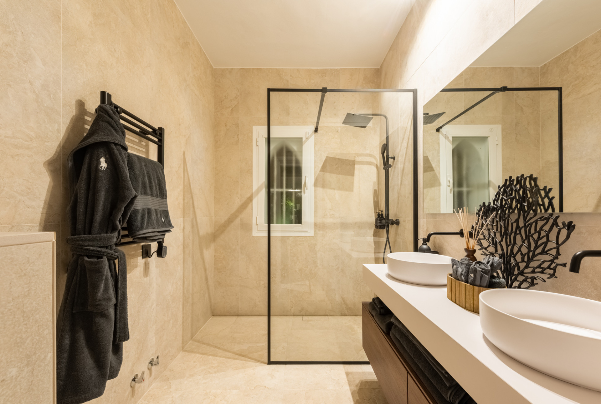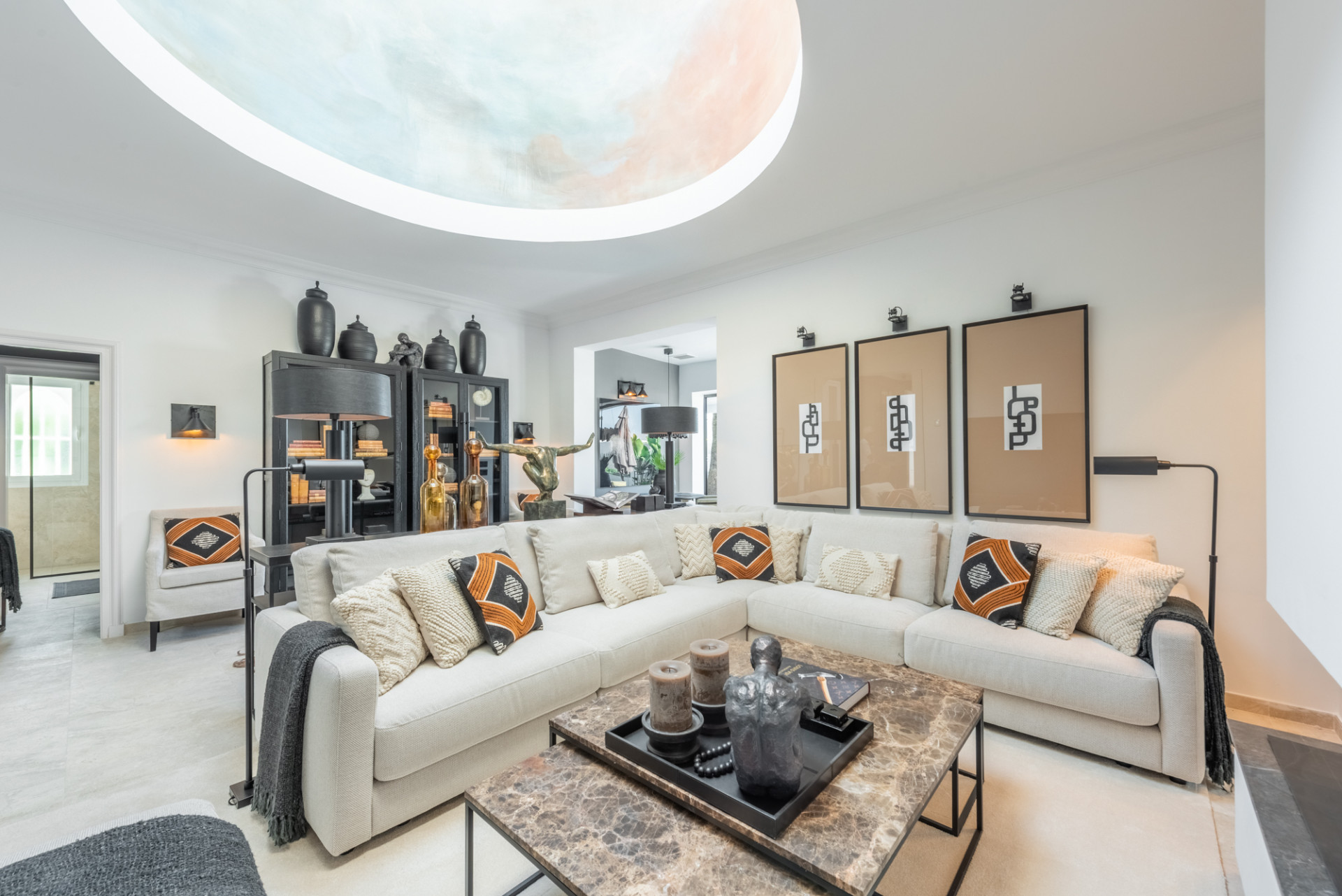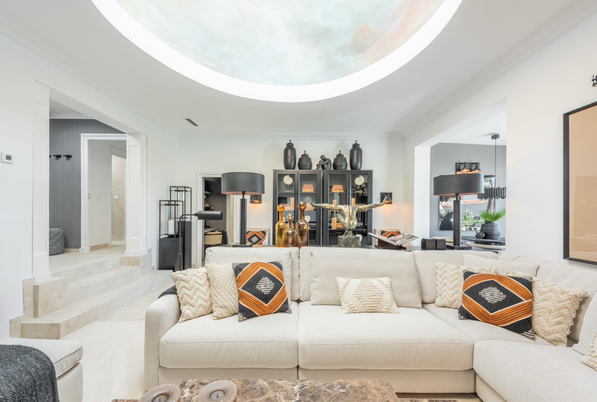 Esta casa de estilo bungalow frente a la playa está literalmente a pocos pasos del mar, situado en la urbanización Oasis Club. Una zona residencial en la Milla de Oro que tiene una ubicación privilegiada en la costa y tiene un gran club de playa dentro de la comunidad. Este complejo está muy cerca de todos los servicios y zonas de ocio de la Milla de Oro y tiene acceso privado directo a la playa y el paseo marítimo desde donde podemos dar un agradable paseo hasta llegar a Puerto Banús a un lado y Marbella hacia el otro lado pasando por los Puente Romano y Marbella Club Grand Luxury Hotels y sus respectivos restaurantes conocidos.