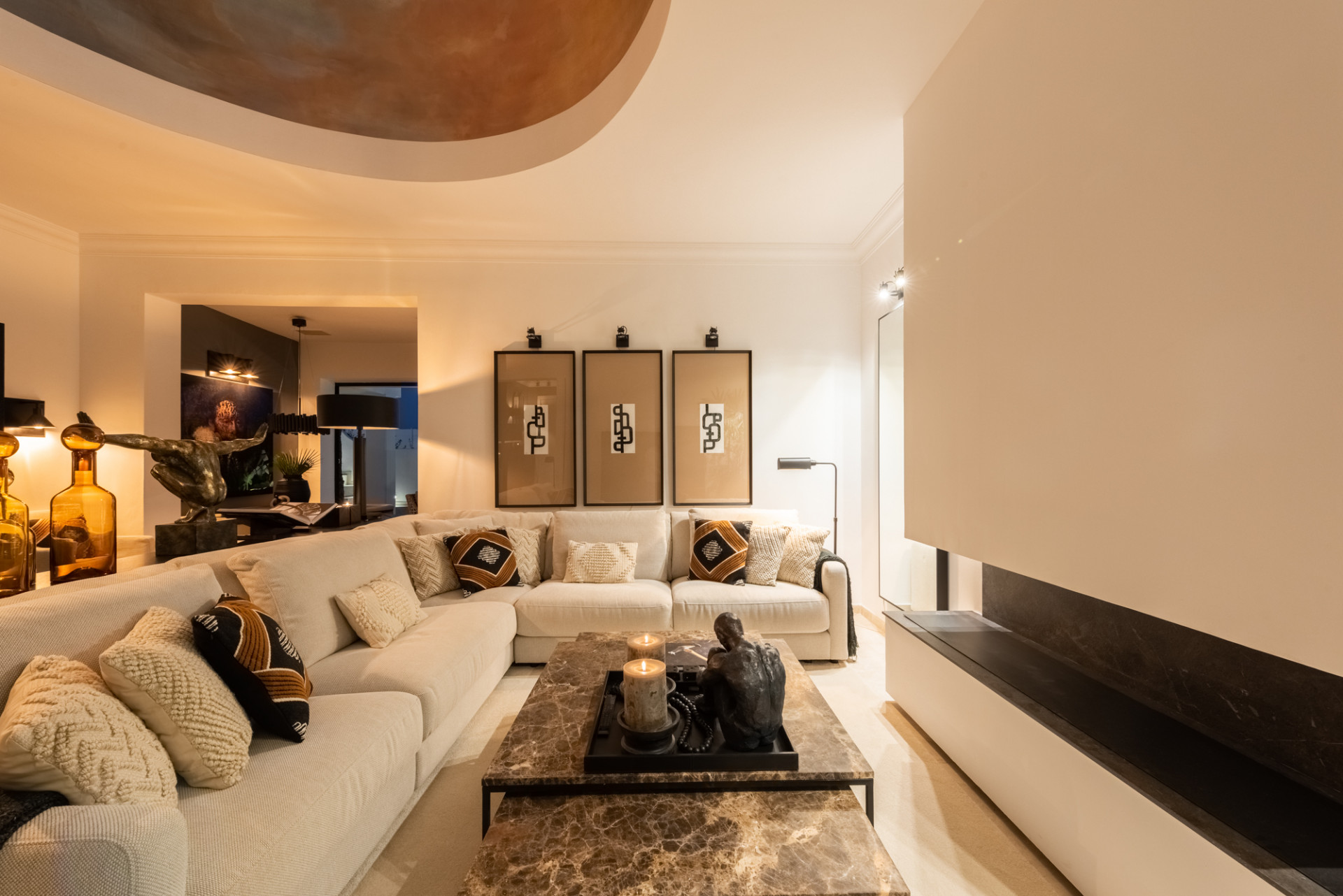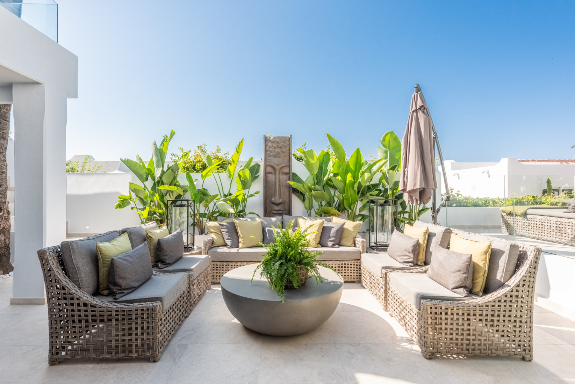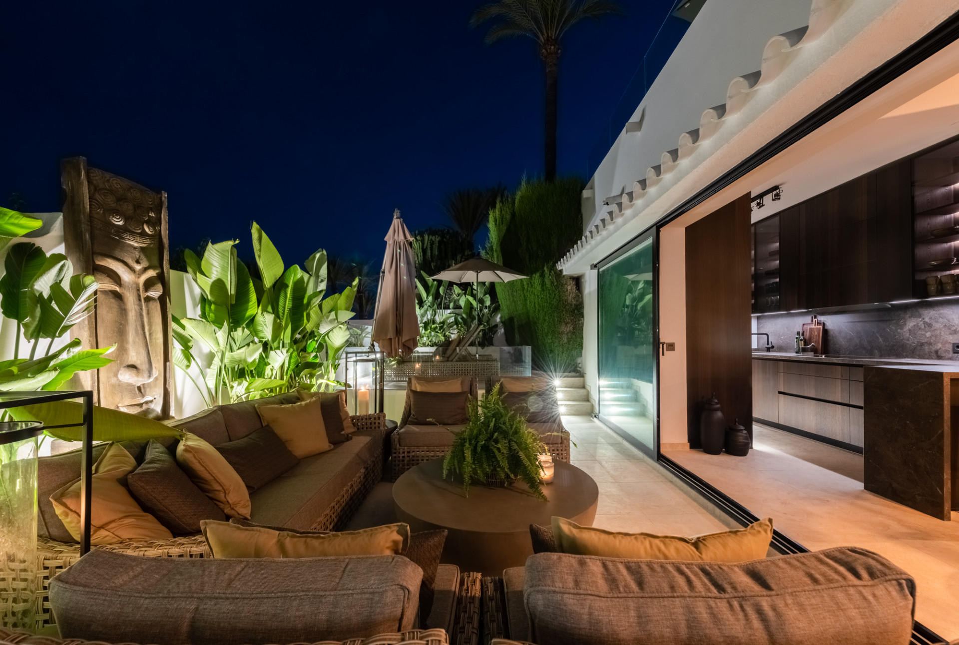 Bungalow de diseño de estilo Scandi en la playa Oasis Club en la Milla de Oro de Marbella.
