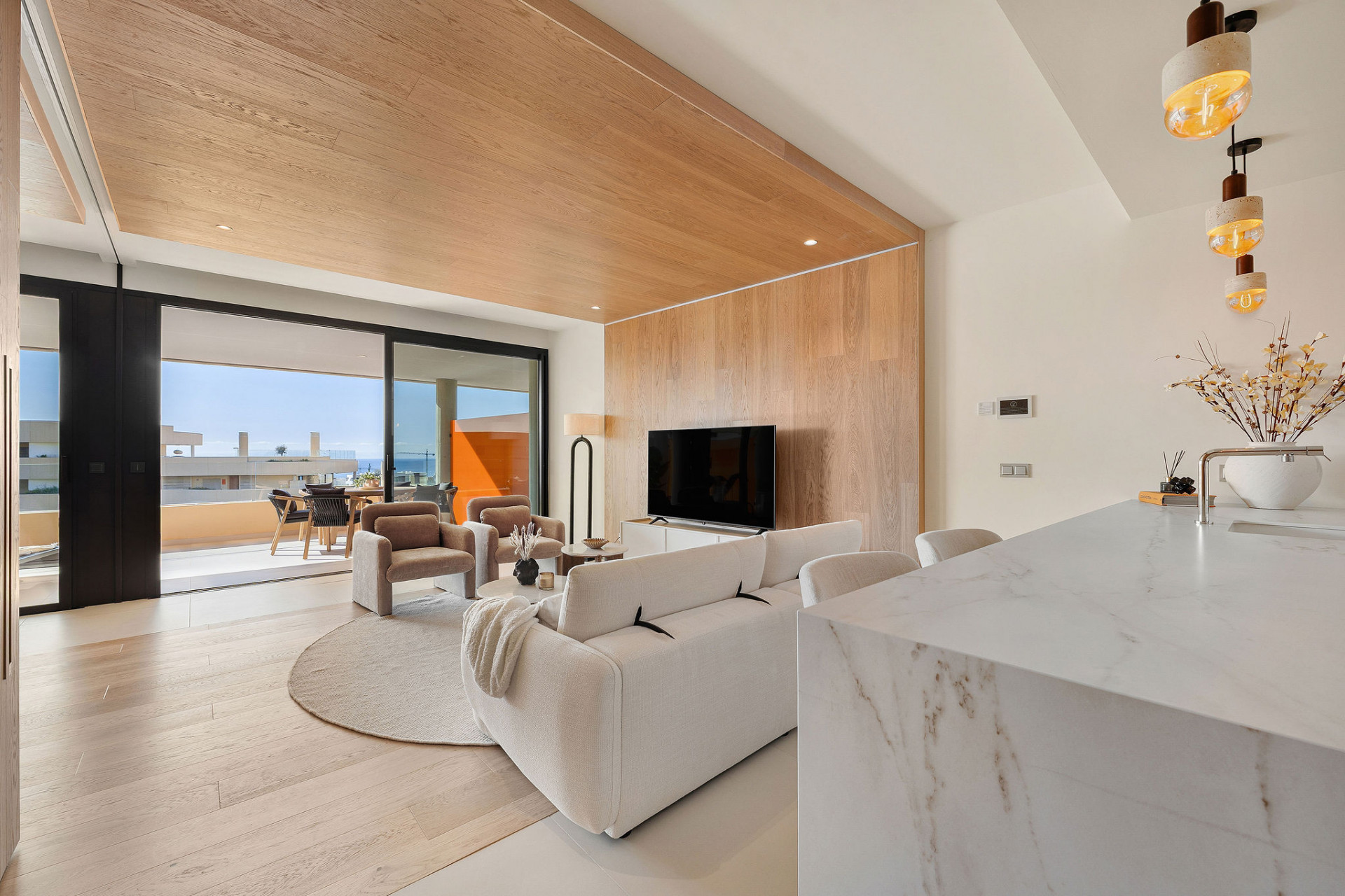 Las ventanas de suelo a techo inundan el espacio con luz natural y enmarcan impresionantes vistas panorámicas, creando una conexión perfecta entre la vida interior y el paisaje circundante. Los interiores están acabados al más alto nivel, con materiales premium, detalla elegante y una sensación moderna y minimalista en todo.